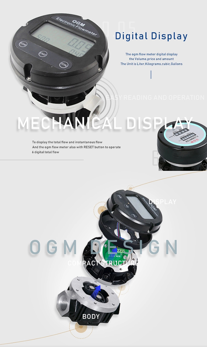 Illustrate:The OGM Series oval rotor positive displacement flow meters will measure your high or varying viscosity liquids. The body takes high pressures and is available in either aluminum PPS. The meter can be supplied with a low cost mechanical totaliser or an LCD display mounted on the top of the flow meter.