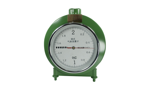 濕式流量計的外殼、轉(zhuǎn)子等主要部件采用純銅板制作。流量計正面是指針、表盤和計數(shù)器,用以記錄氣體的流量值;正面左側(cè)是液位顯示窗,用以顯示內(nèi)部的水位。流量計背面有進(jìn)氣接頭和放水閥。流量計頂部有壓力計、溫度計的兩插入孔、水平儀和出氣接頭;兩插入孔可插入壓力計和溫度計以顯示流經(jīng)流量計氣體的壓力及溫度,同時,也可作為注水孔給流量計加水;水平儀顯示流量計的水平狀態(tài)。流量計底部設(shè)有三個可校準(zhǔn)水平的螺釘支腳。